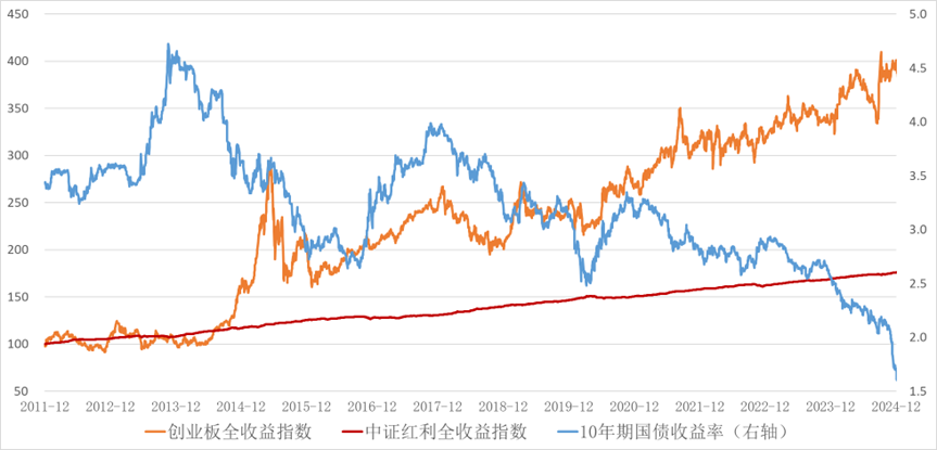 注:为便于比较期间走势,对创业板全收益指数与中证红利全收益指数进行标准化处理
