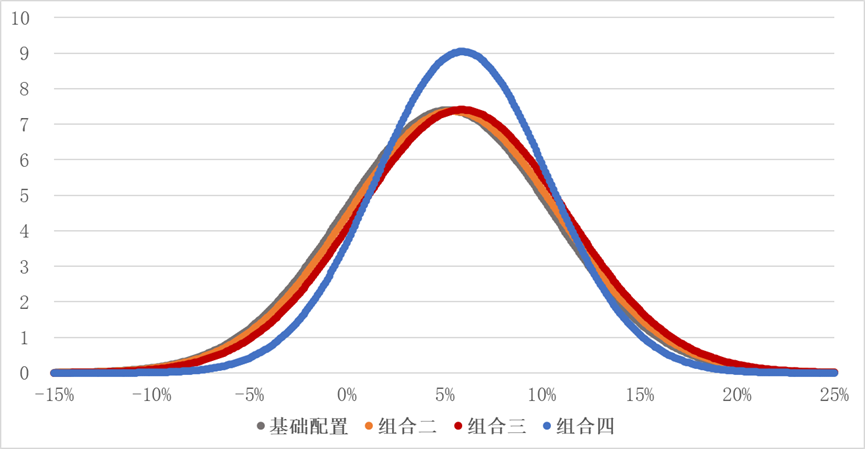 组合四在组合三的基础上加入定期再平衡机制。每个季度初对组合的资产配置进行再平衡,使各大类资产的持仓比例回到预设水平,即,80%中债-企业债AAA财富(1-3年)指数,10%沪深300全收益指数,5%中证红利全收益指数,5%创业板全收益指数。该组合期间累计收益率118.43%,年化平均收益率5.93%,年化波动率4.41%,夏普比率0.95。组合四的表现更加符合年金基金绝对收益目标要求。亏损概率降至10%以下,达成4%至6%收益目标的概率提升。获得7%以上收益率的概率虽然小幅降低,但仍保留40%以上的概率贡献向上弹性。