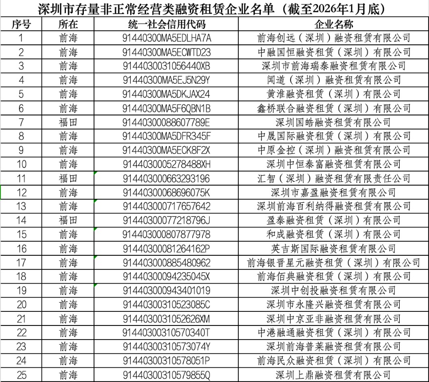根据公告,深圳市此前已分两批公告了非正常经营类融资租赁公司名单,第一批于2024年5月30日公布,第二批于2025年3月10日公布。此次公告的766家企业为截至2026年1月底尚未退出的存量名单。