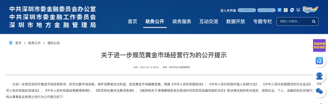 深圳市地方金融管理局网站2月13日日消息,深圳市地方金融管理局等10部门发布《关于进一步规范黄金市场经营行为的公开提示》。
