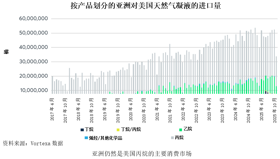 尽管亚洲三大主要市场的动态变化带来了挑战,但其庞大的整体需求将继续使该地区成为美国液化石油气出口的重要目的地。Vortexa的最新数据显示,按产品划分,亚洲天然气凝液进口在截至2025年10月的12个月表现强劲。2025年美国天然气凝液总出口达到约5.2亿桶,与2024年的水平大致相当。丙烷约占总出口量的60%,部分原因在于丙烷脱氢装置的发展,这类装置以丙烷为原料,生产乙烯等其他化工产品。