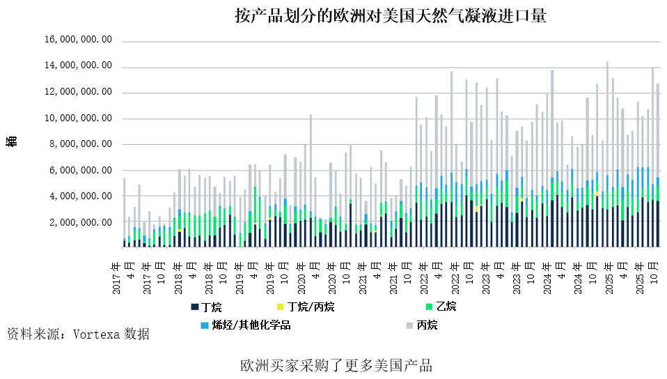 随着欧洲逐步降低对俄罗斯等长期供应方的依赖,其自美国等产量快速增长地区的进口规模持续扩大。根据船舶追踪机构Vortexa的最新数据,2025年美国对欧洲的天然气凝液总出口量已增至约1.35亿桶,较2024年同比增长超过15%。不断增加的美国天然气凝液流向,可以通过蒙特贝尔维尤金融基准以及任何区域性基差合约进行对冲,例如西北欧的Argus交割合约。