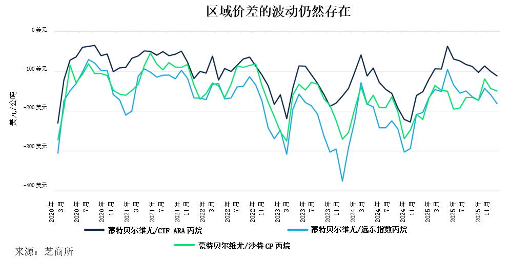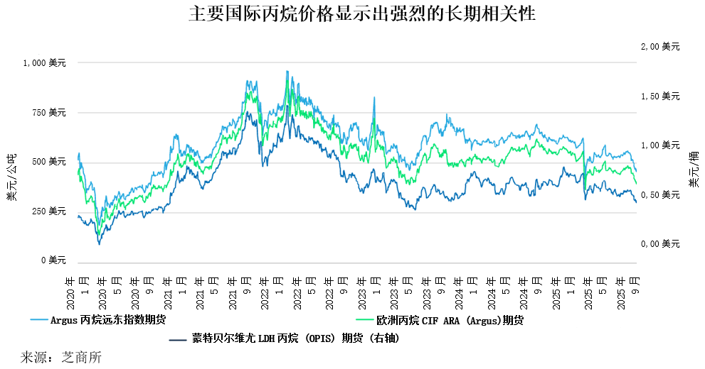 由于页岩气产量增加,美国已成为重要的液化石油气出口国,蒙特贝尔维尤液化石油气定价的影响力也随之增长,并进一步与国际市场相连。美国、亚洲和欧洲等主要市场的价格显示出强劲的长期相关性。然而,美国、亚洲和欧洲之间的区域价差波动加剧,部分原因在于运费水平的变化,以及不同地区供需结构差异对价格形成的影响。