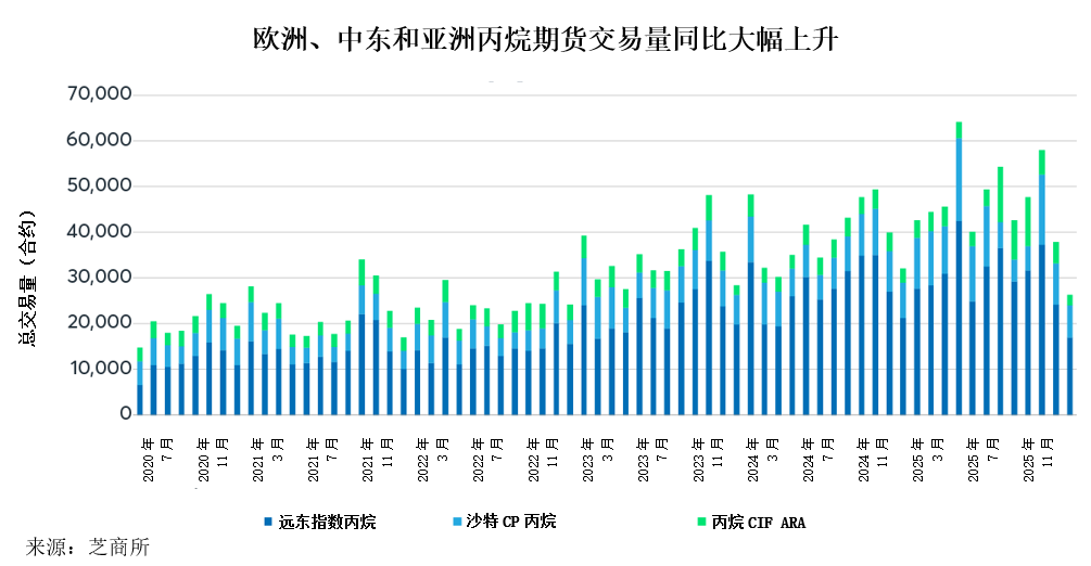 欧洲和亚洲的天然气凝液市场的交易量增长势头强劲。以丙烷市场为例,欧洲丙烷交易量持续上升,2025年欧洲丙烷月均交易量较2024年同比增长约60%。交易所最新数据显示,2025年欧洲丙烷月度总交易量约为6,000份合约。远东指数丙烷的交易量也有所增加,2025年相较于2024年整体交易量上升11%,月度总交易量约为30,000份合约。交易员表示,随着企业寻求在欧洲或亚洲枢纽与美国墨西哥湾沿岸之间进行价差交易,挂钩蒙特贝尔维尤价格的合约正成为越来越受欢迎的选择。