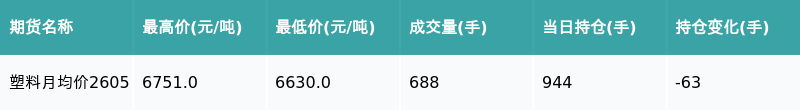 南财智讯2月13日电,盘后期货数据显示,大连商品交易所的塑料主力合约收跌2.09%,收盘报6644.0元/吨,日内资金流入152.44万元。其他相关指标见下表: