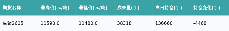 南财智讯2月13日电,盘后期货数据显示,大连商品交易所的生猪主力合约收跌0.22%,收盘报11500.0元/吨,日内资金流入8.6亿元。其他相关指标见下表: