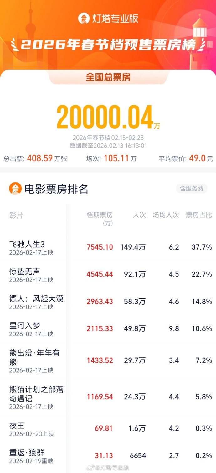 据灯塔专业版,截至2月13日16时13分,2026春节档(2月15日-2月23日),档期预售总票房突破2亿元。