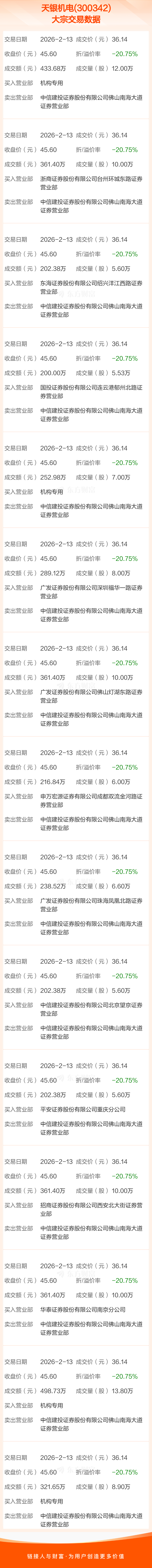 2026年2月13日,天银机电发生15笔大宗交易,共成交124.63万股,成交金额4504.26万元,占其流通市值比例为0.24%。