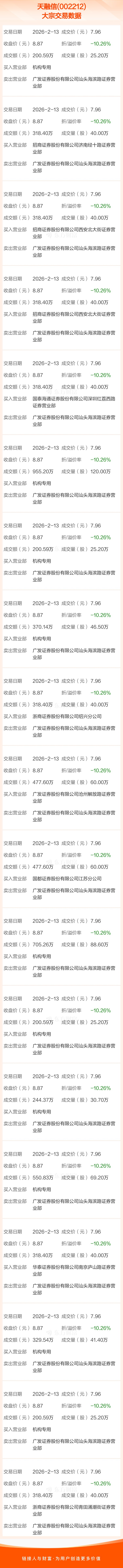 2026年2月13日,天融信发生19笔大宗交易,共成交897.20万股,成交金额7141.70万元,占其流通市值比例为0.69%。