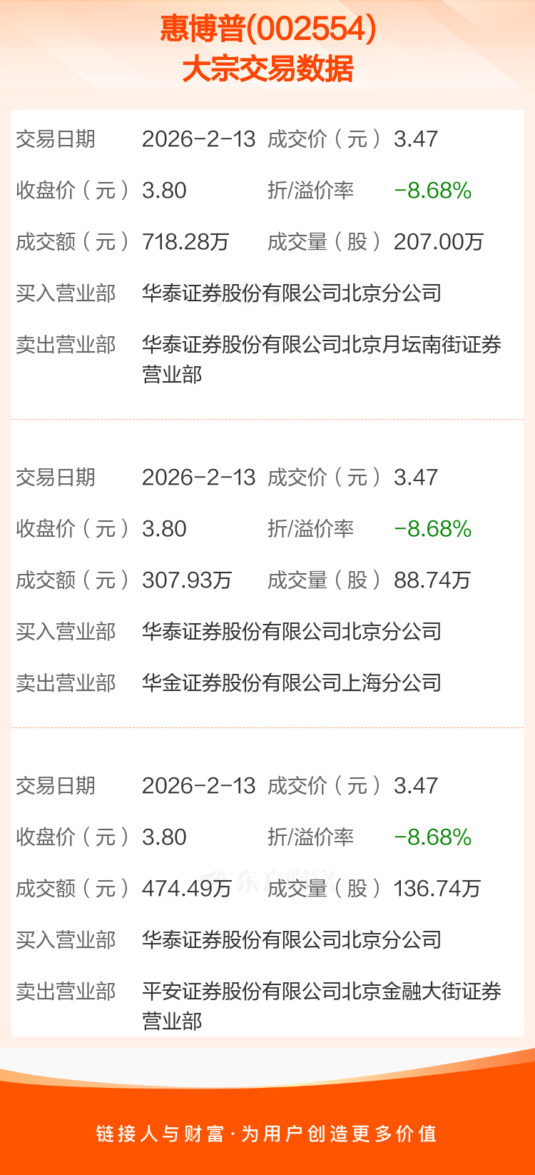 2026年2月13日,惠博普发生3笔大宗交易,共成交432.48万股,成交金额1500.70万元,占其流通市值比例为0.30%。