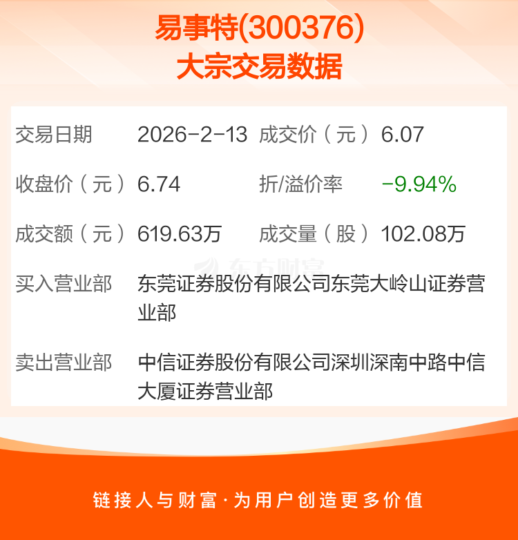 2026年2月13日,易事特发生1笔大宗交易,共成交102.08万股,成交金额619.63万元,占其流通市值比例为0.04%。