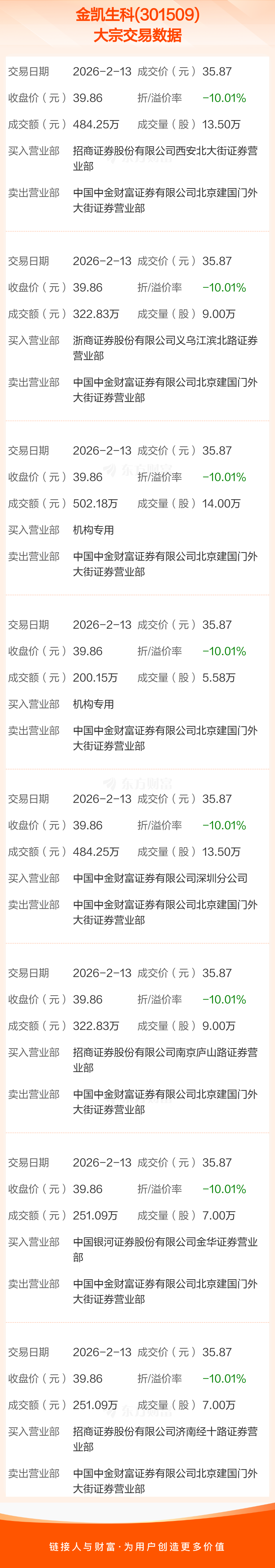 大宗交易:金凯生科成交2818.67万元,折价10.01%(2-13)