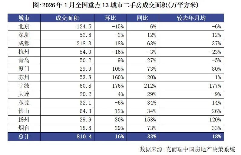 克而瑞数据监测显示,1月,全国重点13城市二手房成交面积约810万平方米,环比上升16%,同比增长33%,相比上年月均增18%。其中,成都二手房成交面积达218万平方米高踞首位,环比增长18%,同比激增63%,相较去年月均增长37%;其次是北京,成交面积约125万平方米,环比下降15%,同比仍持平稳增6%,相较去年月均下降6%。