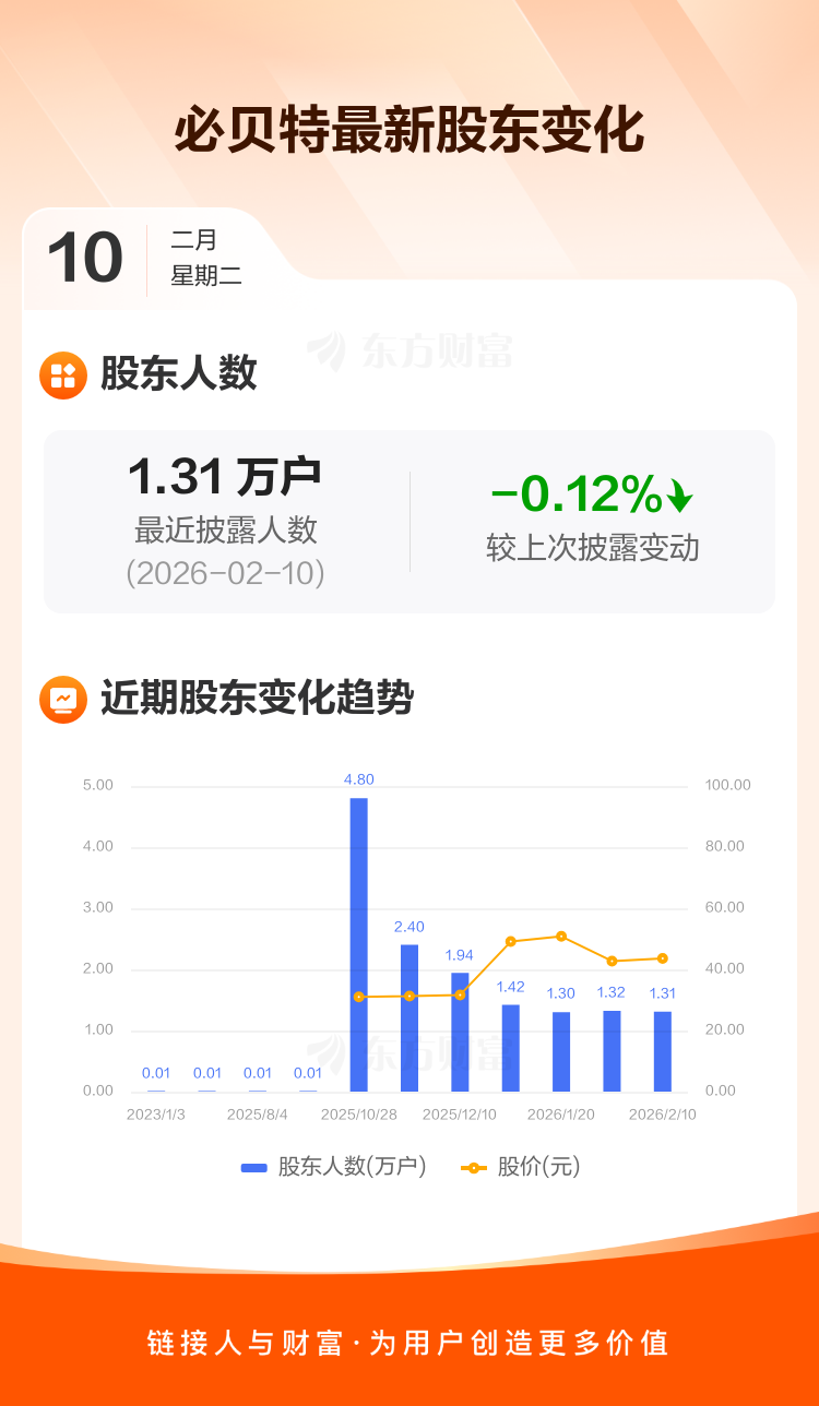 必贝特:截至2月10日最新股东户数1.31万户,较上期减少0.12%