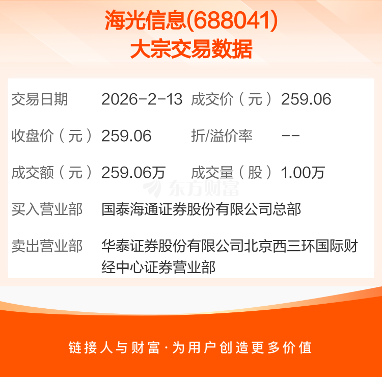 2026年2月13日,海光信息发生1笔大宗交易,共成交1.00万股,成交金额259.06万元。
