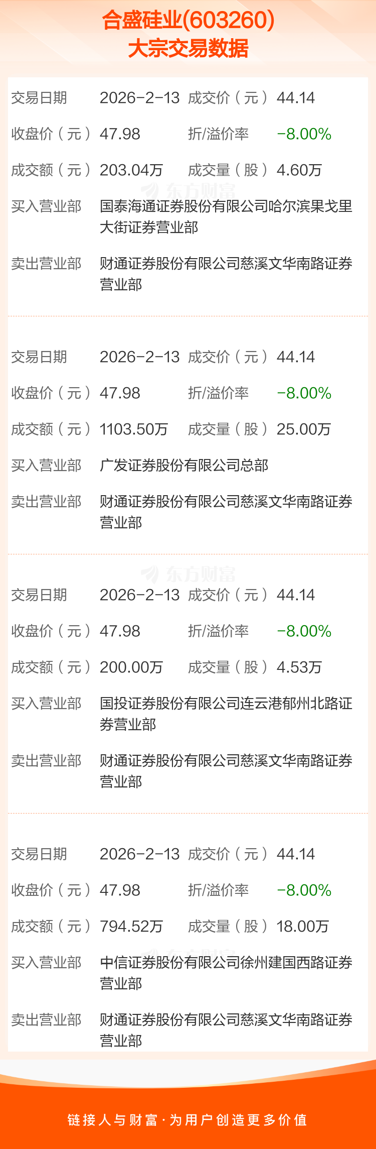 2026年2月13日,合盛硅业发生4笔大宗交易,共成交52.13万股,成交金额2301.06万元,占其流通市值比例为0.04%。