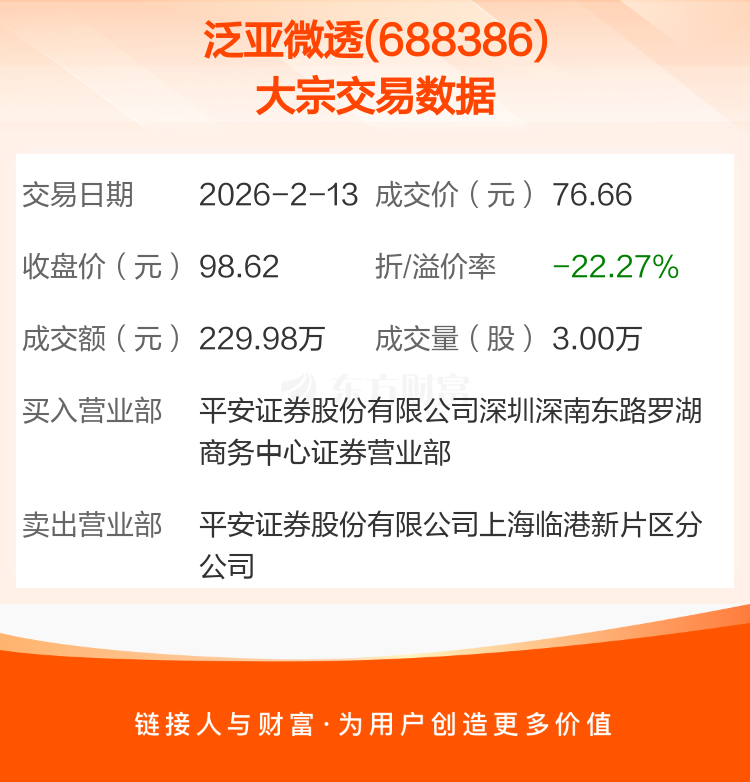 2026年2月13日,泛亚微透发生1笔大宗交易,共成交3.00万股,成交金额229.98万元,占其流通市值比例为0.03%。