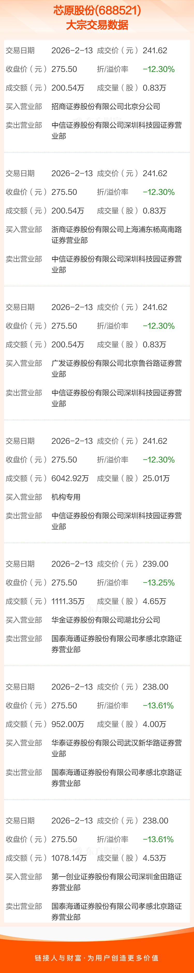 2026年2月13日,芯原股份发生7笔大宗交易,共成交40.68万股,成交金额9786.03万元,占其流通市值比例为0.07%。