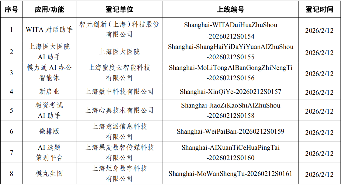 据“网信上海”公众号消息,截至2月13日,上海市新增8款已完成登记的生成式人工智能服务,累计已完成161款生成式人工智能服务登记。其中,智元创新(上海)科技股份有限公司的WITA对话助手在列。