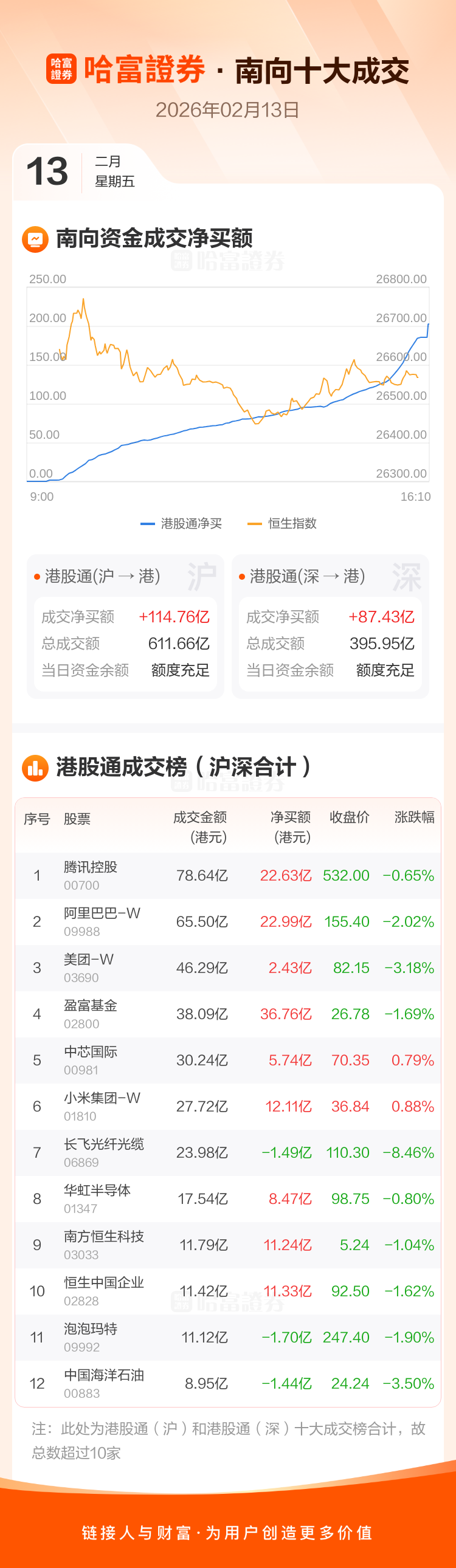 恒生指数2月13日跌1.72%,收报26567.12点。南向资金今日净买入港股202.19亿港元。南向资金今日成交额1007.61亿港元,港股大市成交2575.78亿港元。
