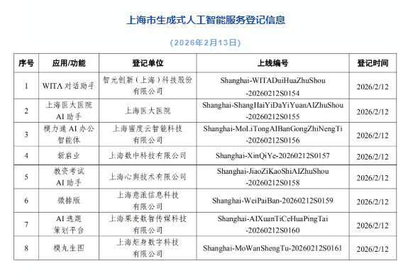 据网信上海微信公众号消息,截至2月13日,上海市新增8款已完成登记的生成式人工智能服务,累计已完成161款生成式人工智能服务登记。
