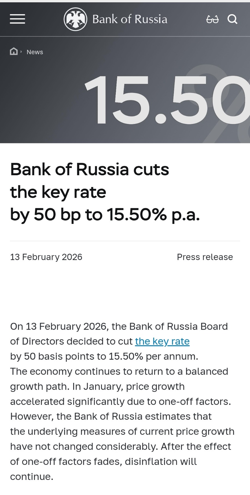 俄罗斯央行2月13日宣布,将基准利率从16%下调50个基点至15.5%。俄罗斯央行预计,当前价格增长的基本指标并未发生显著变化。一次性因素的影响消退后,通货紧缩将继续。
