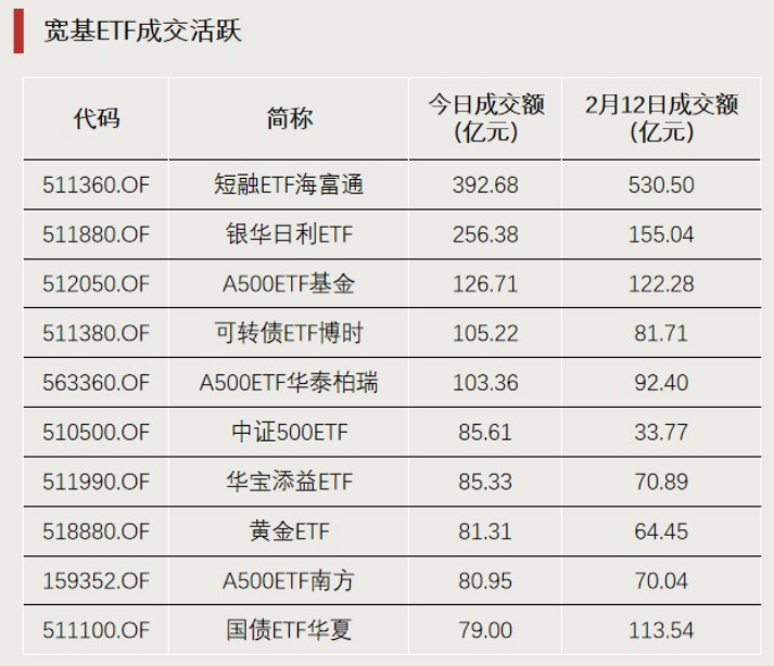 宽基ETF今日成交活跃。两只跟踪中证A500指数的ETF成交额突破100亿元。此外,中证500ETF(510500)、A500ETF南方成交额均超80亿元。