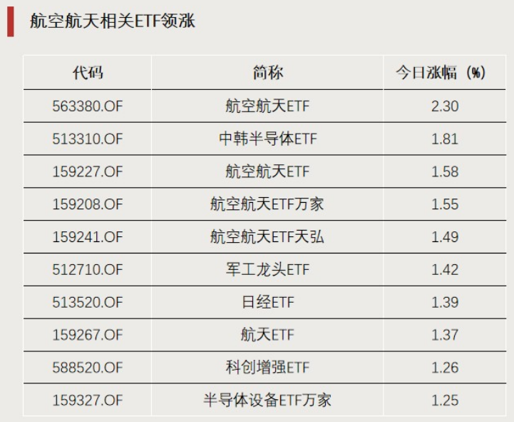 2月13日,A股航空航天板块逆势走强,带动相关ETF上涨。涨幅前十的ETF中,有5只为航空航天相关ETF。