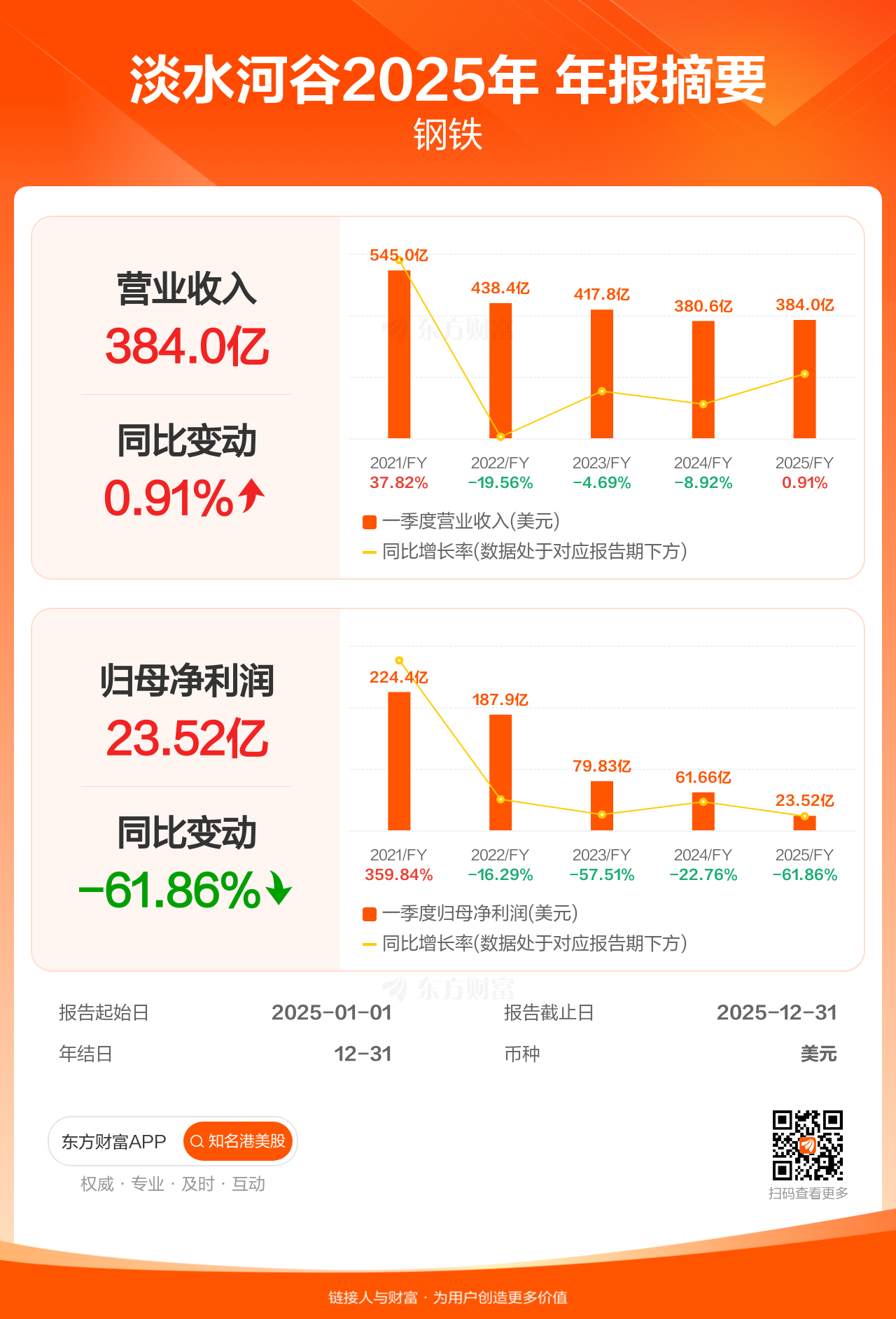 淡水河谷2月13日发布年报业绩,截至2025年12月31日的12个月内,该公司营业收入384.03亿美元,同比增长0.91%;公司权益持有人应占溢利(归母净利润)23.52亿美元,同比减少61.86%,低于机构一致预测的86.48亿美元。
