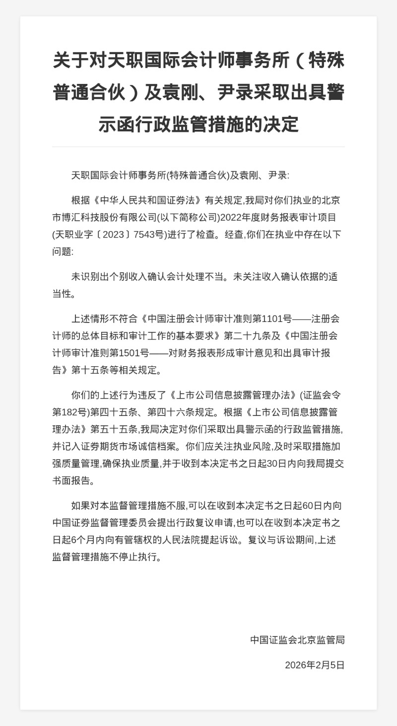 天职国际会计师事务所被出具警示函,涉财报审计项目违规
