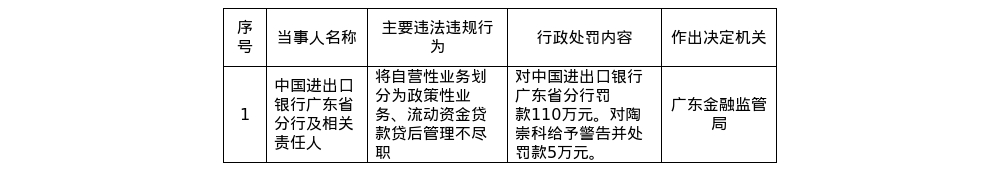 中国进出口银行广东省分行被罚110万,涉贷款管理不尽职等