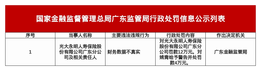 光大永明人寿广东分公司被罚12万,涉财务数据不真实