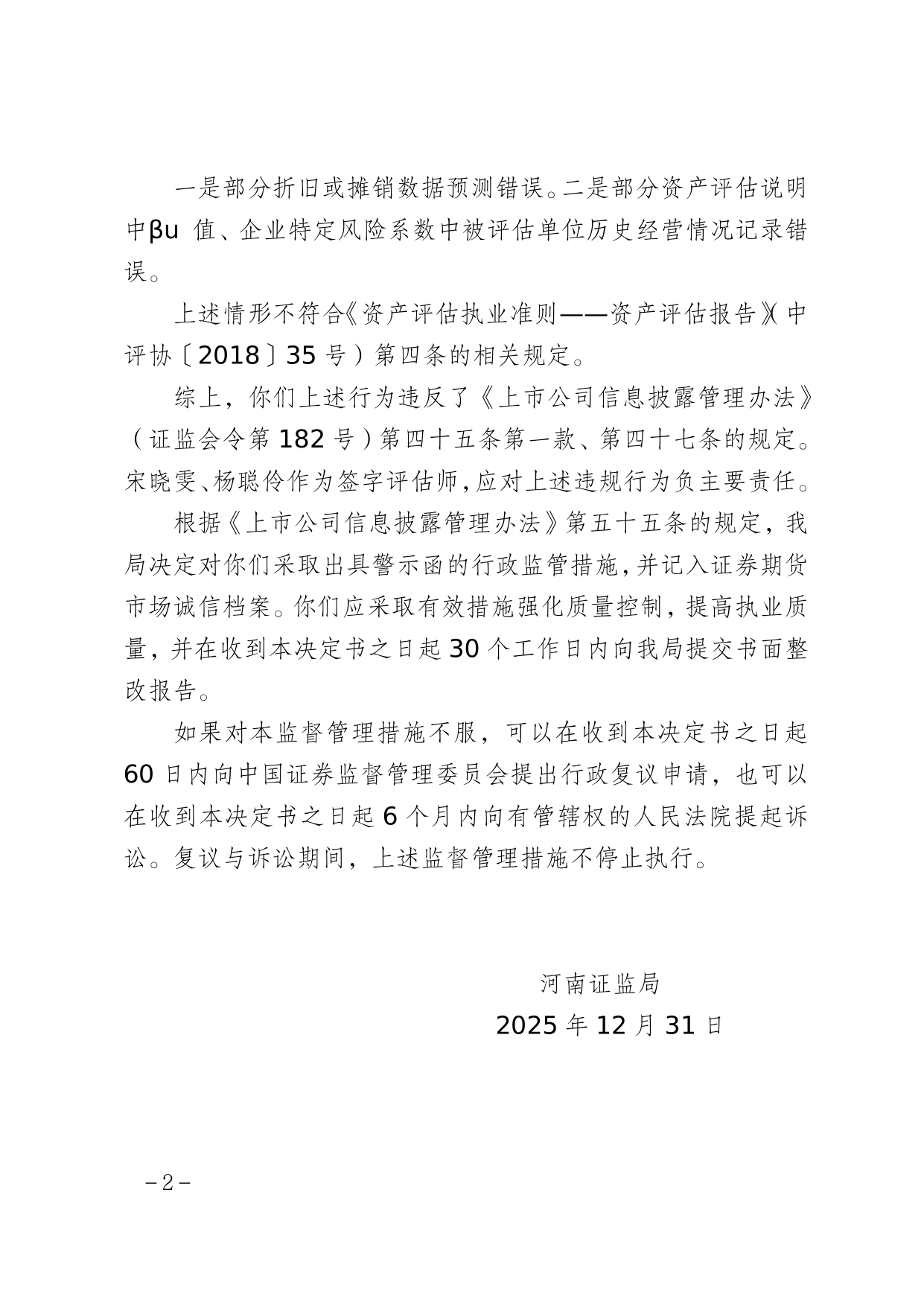 对此,河南证监局决定对北京亚太联华资产评估有限公司及资产评估师宋晓雯、杨聪伶采取出具警示函的行政监管措施,并记入证券期货市场诚信档案。