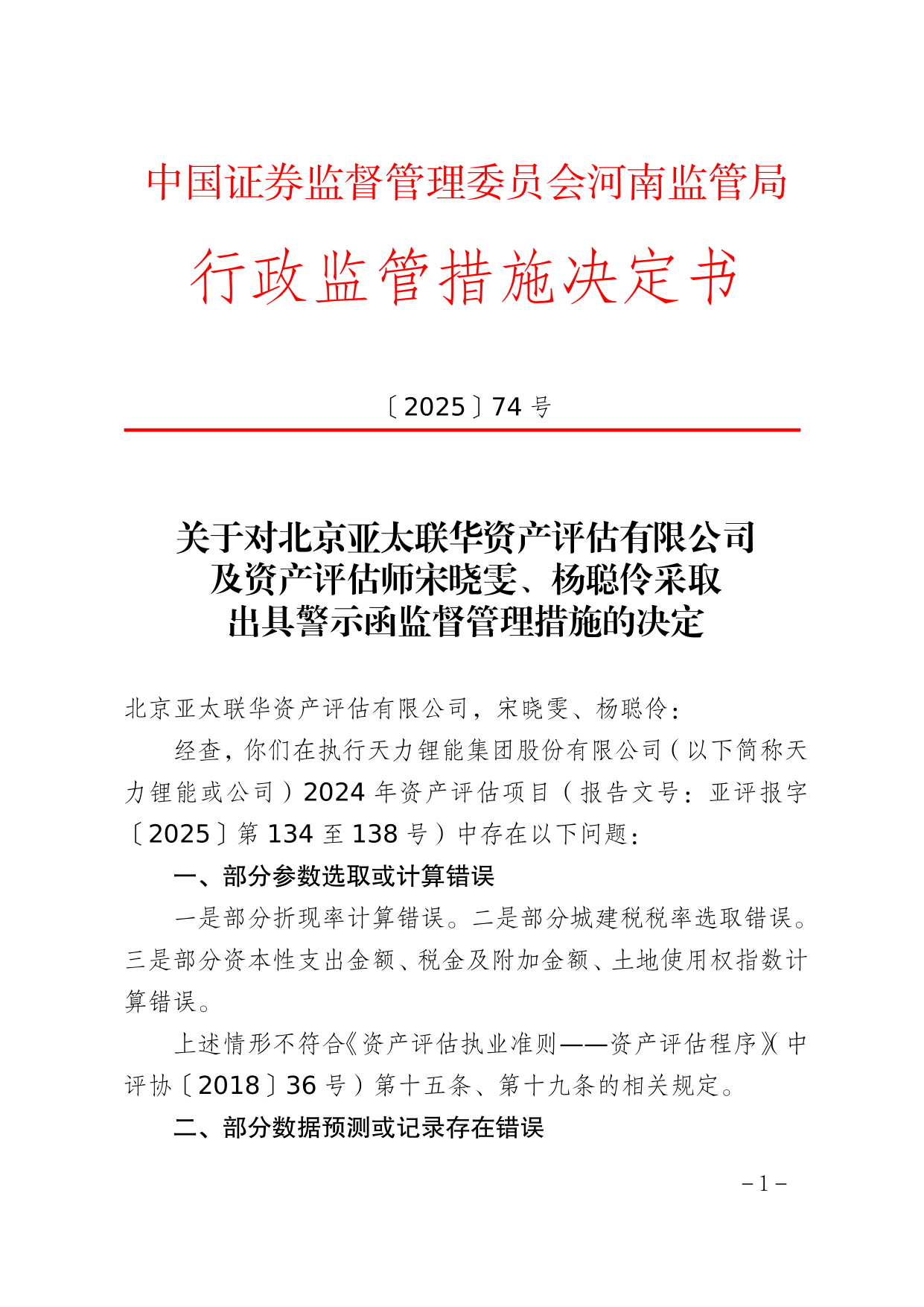 决定书显示,北京亚太联华资产评估有限公司在执行天力锂能集团股份有限公司2024年资产评估项目中存在以下问题:部分参数选取或计算错误;部分数据预测或记录存在错误。