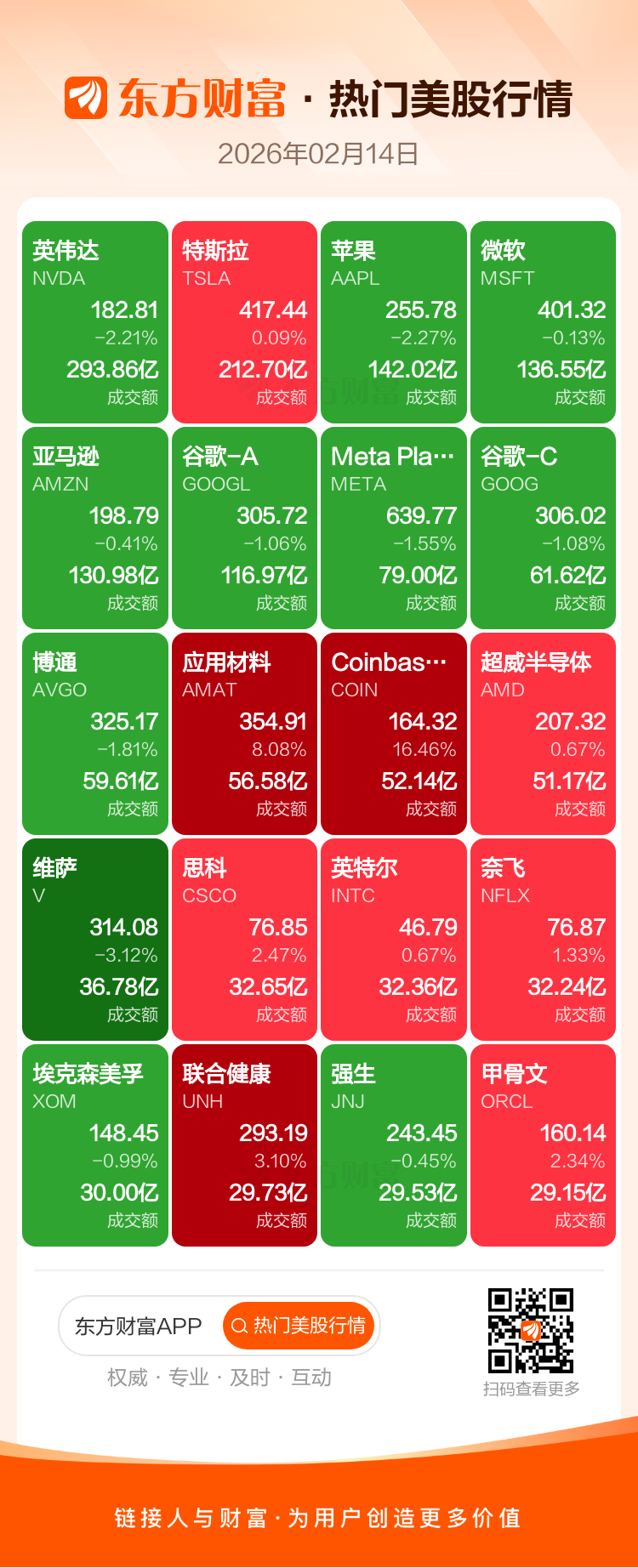 英伟达跌2.21%,特斯拉涨0.09%,苹果跌2.27%,微软跌0.13%,亚马逊跌0.41%,谷歌-A跌1.06%,Meta Platforms Inc-A跌1.55%,谷歌-C跌1.08%,博通跌1.81%,应用材料涨8.08%。