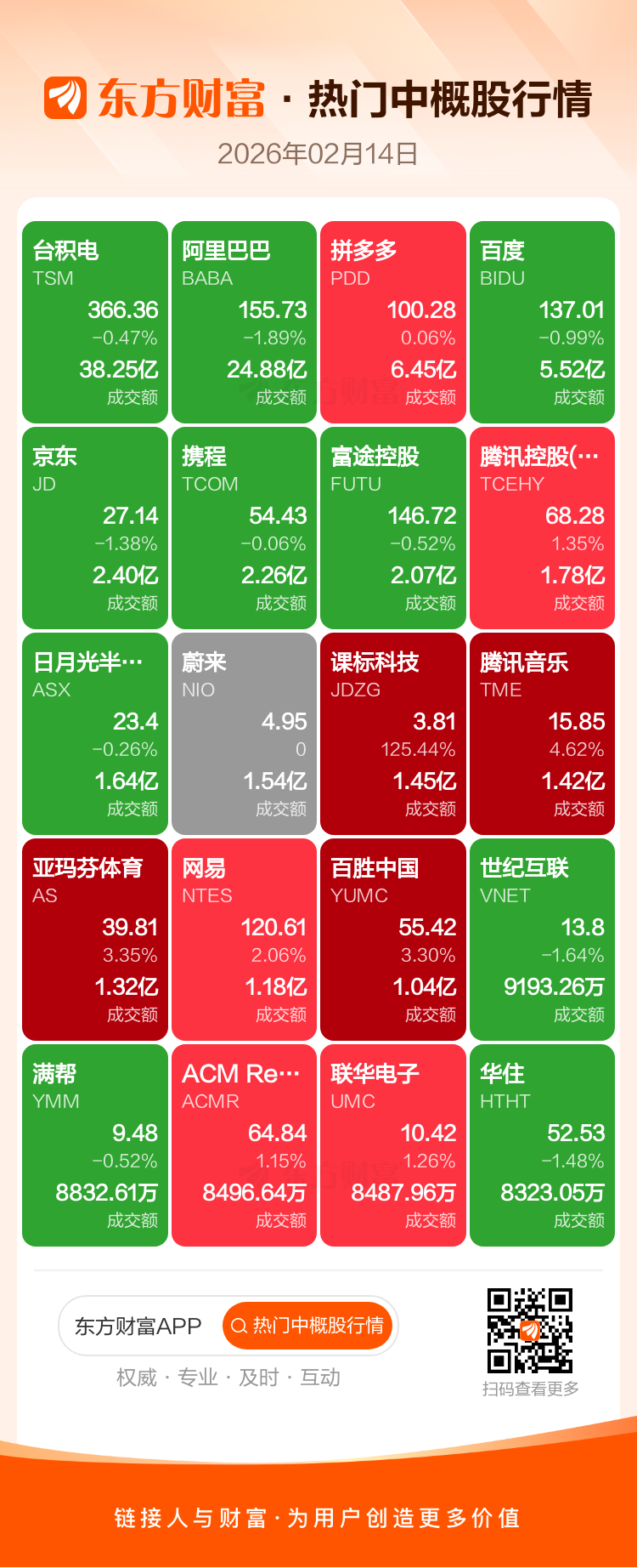 台积电跌0.47%,阿里巴巴跌1.89%,拼多多涨0.06%,百度跌0.99%,京东跌1.38%,携程跌0.06%,富途控股跌0.52%,腾讯控股(ADR)涨1.35%,日月光半导体跌0.26%,蔚来平收。