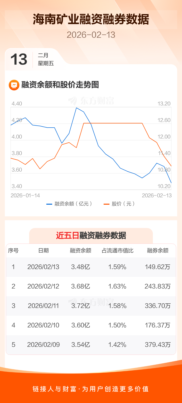 交易所最新数据显示,海南矿业于2026年2月13日获融资买入2715.46万元,融资偿还4743.99万元,当日融资净偿还2028.52万元。目前,该股融资余额3.48亿,占流通市值比例为1.59%。
