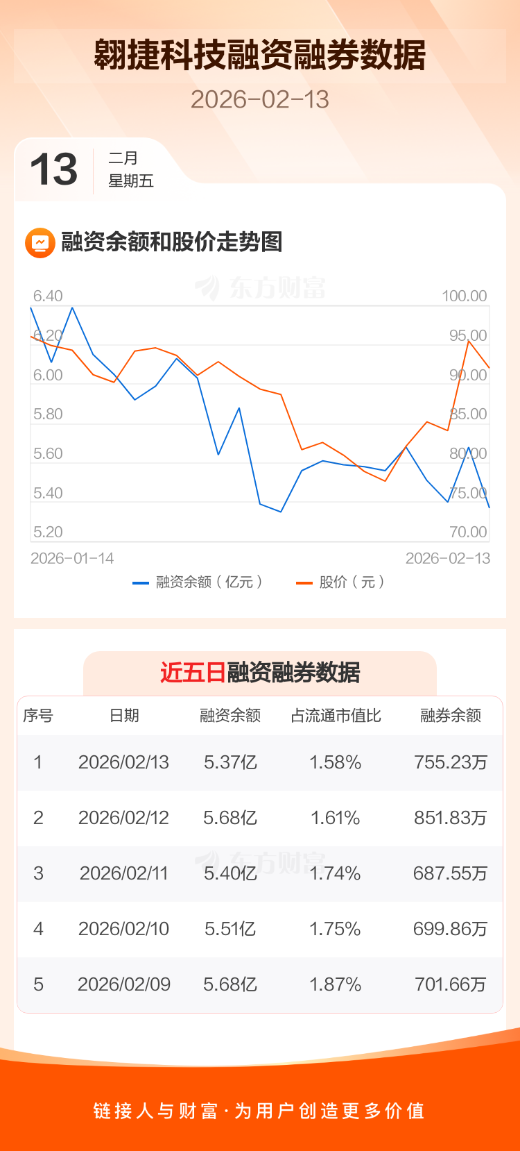交易所最新数据显示,翱捷科技于2026年2月13日获融资买入6024.20万元,融资偿还9101.62万元,当日融资净偿还3077.42万元。目前,该股融资余额5.37亿,占流通市值比例为1.58%。