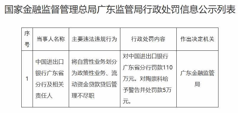 中国进出口银行广东省分行被罚110万元