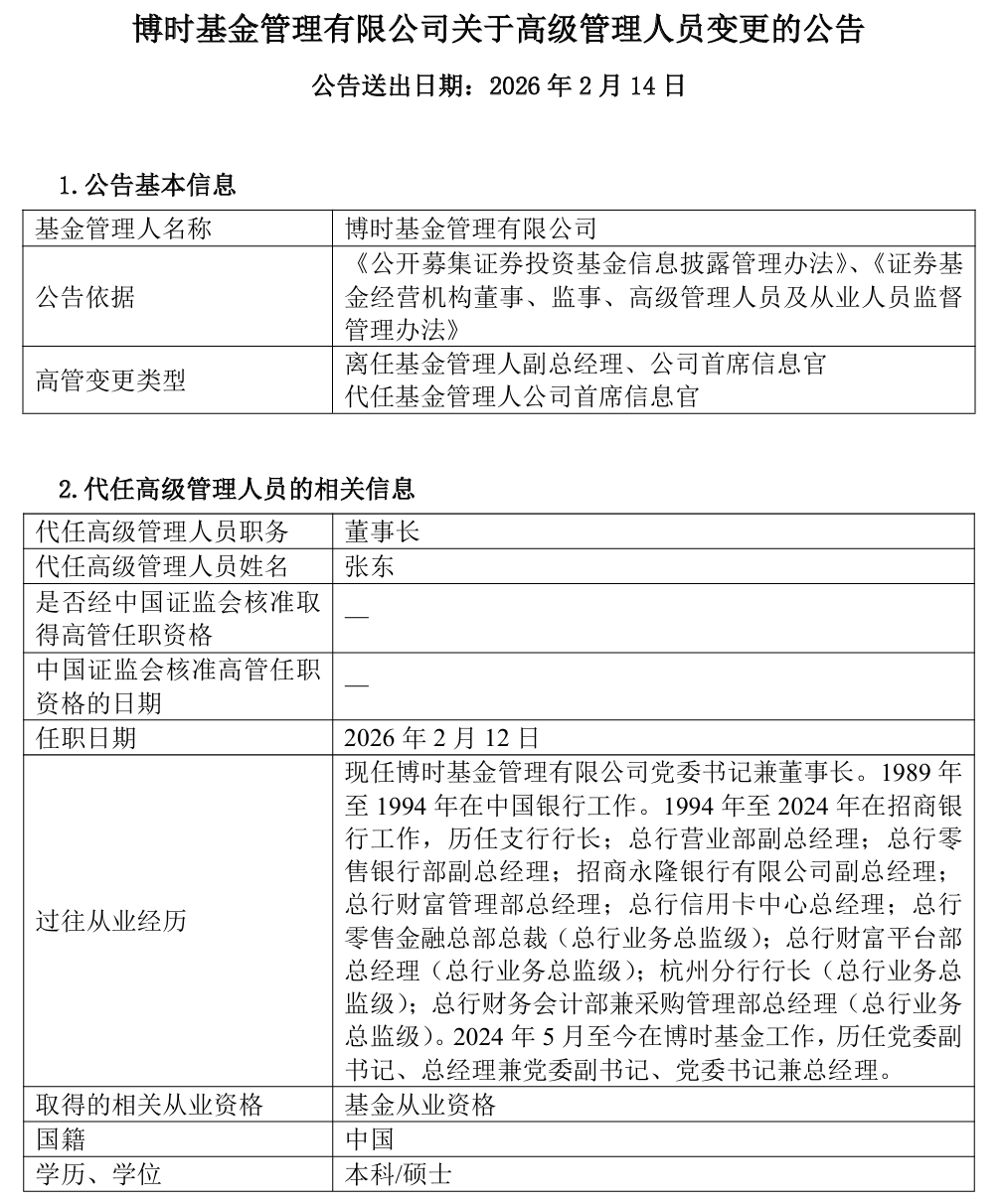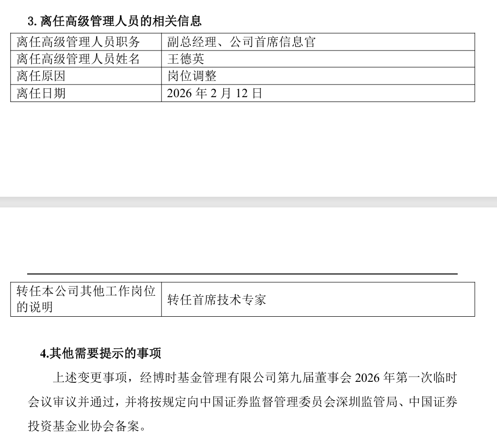 一是博时基金,自2月12日起,王德英离任博时基金副总经理兼首席信息官,转任首席技术专家,董事长张东代任首席信息官一职。