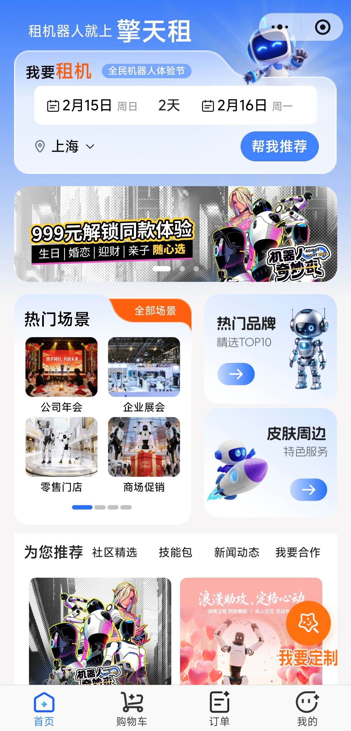 2026年春节期间,机器人租赁需求正在集中释放。擎天租平台数据显示,截至2月12日,平台已累计收到覆盖春节假期的订单超过1000单。综合当前已下单及预约情况测算,整个春节假期内平台整体GMV预计环比涨80%。截至春节假期结束,平台累计订单量预计将突破5000单。