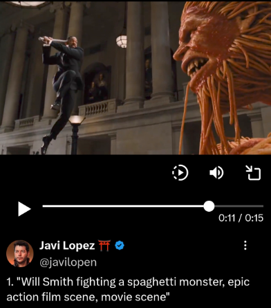 贾维·洛佩兹使用Seedance2.0生成“史密斯大战意大利面”怪物。社交平台截图