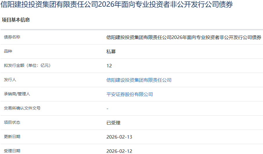 【大河财立方消息】2月14日消息,信阳建投投资集团有限责任公司2026年面向专业投资者非公开发行公司债券项目获上交所受理。债券拟发行金额12亿元,承销商/管理人为平安证券。2025年7月25日,经中证鹏元综合评定,发行人主体信用评级为AA+,展望稳定。