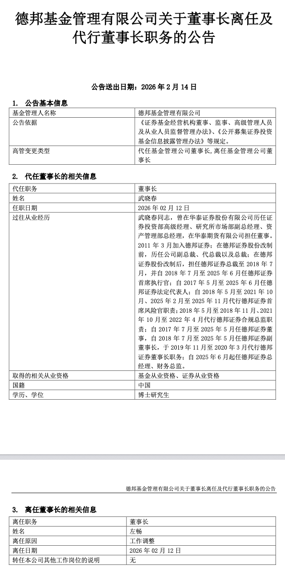2月14日,德邦基金发布高管变更公告,经公司董事会审议通过,左畅因“工作调整”不再担任公司董事长职务,德邦证券总经理、财务总监武晓春代任该职,上任日期为2月12日。