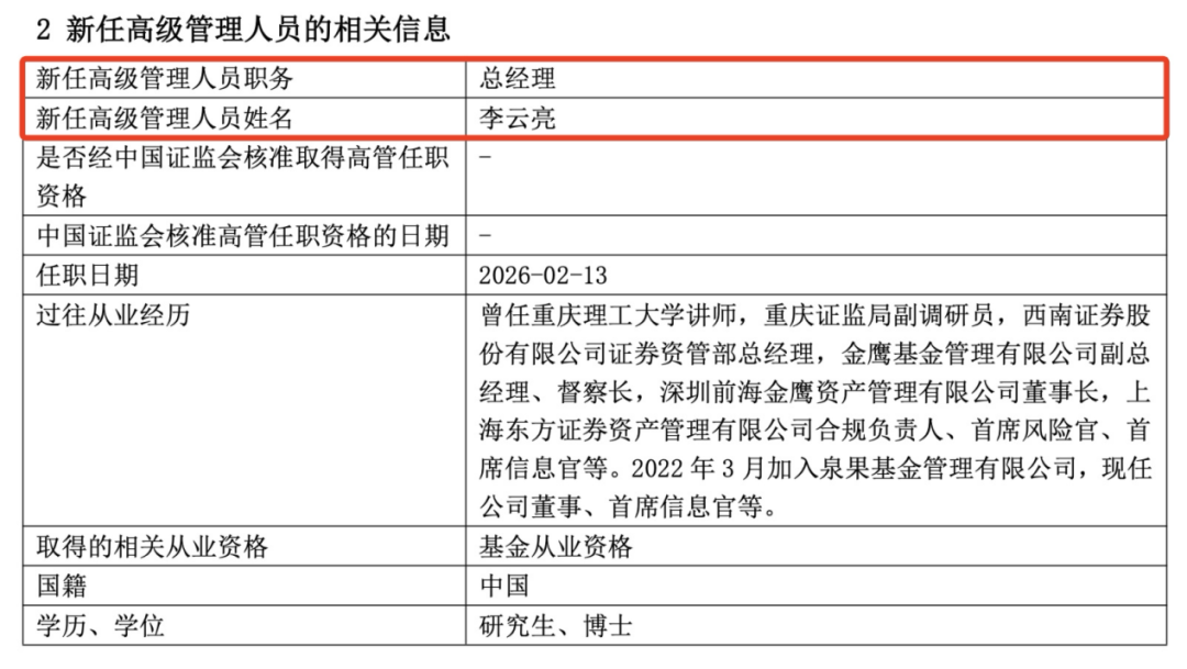 2月14日,泉果基金发布高级管理人员变更公告,合规负责人、风控负责人李云亮因工作安排,转任公司总经理。
