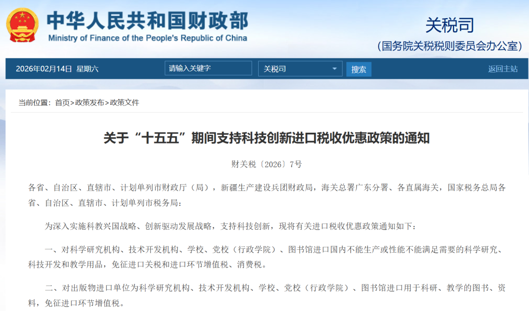 【导读】财政部等三部门出台“十五五”期间支持科技创新进口税收优惠政策