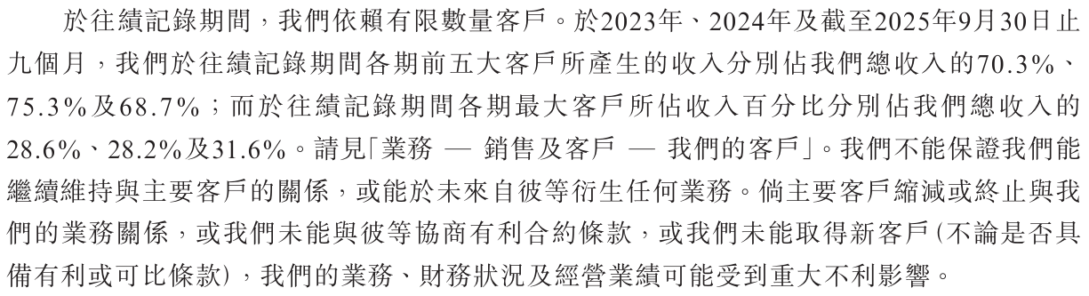 公司收入来源高度依赖少数头部客户,这既支撑了其在新能源赛道的快速切入,也形成了显著的经营约束。报告期内,前五大客户收入占比分别为2023年的70.3%、2024年的75.3%以及2025年前三季度的68.7%。最大单一客户收入占比保持在28.6%至31.6%之间。
