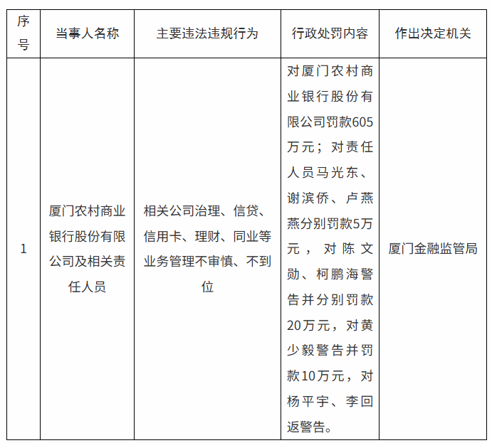 同时,厦门金融监管局对责任人员马光东、谢滨侨、卢燕燕分别罚款5万元,对陈文勋、柯鹏海警告并分别罚款20万元,对黄少毅警告并罚款10万元,对杨平宇、李回返警告。