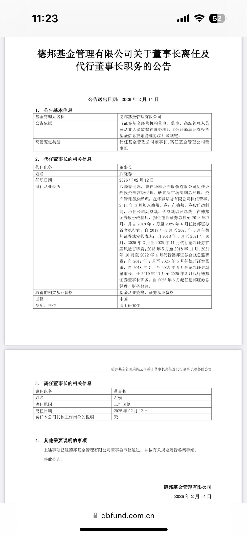 2月14日,德邦基金宣布,因工作调整,左畅不再担任公司董事长,德邦证券总经理、财务总监武晓春自2月12日起代行董事长职责。本次调整已履行董事会审议程序并完成监管备案,为公司治理层面常规人事安排。
