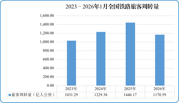 客运方面。1月份,全国铁路完成旅客发送量3.49亿人次,同比下降5.2%;完成旅客周转量1170.59亿人公里,同比下降19.1%。受2026年铁路春运于2月2日启动、较上年推后20天的影响,旅客发送量同比下降,预计2月份将呈增长趋势。